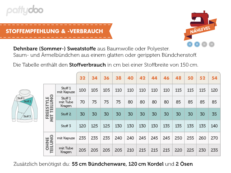 Der Schnittmusterbogen in A0-Format enthält die Schnittteile für alle Varianten von Gr. 32 bis 54, dazu gibt es ein Booklet mit Maßtabellen, Zuschnittplänen und Tipps zum Anpassen der Größen.